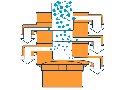 旋振篩采用YZUL立式振動電機作為激振源,通過振動電機上下兩端的偏心重錘將旋轉(zhuǎn)運動轉(zhuǎn)變?yōu)樗、垂直、傾斜的三次元運動,并傳遞到篩粉機的篩面上;物料通過入料口進入設(shè)備內(nèi),根據(jù)不同物料篩分要求,物料經(jīng)過1-5層采用不同目數(shù)的金屬編織篩網(wǎng)的篩分層,在這個過程中,位于各層的篩網(wǎng)下的清網(wǎng)裝置(彈跳球)通過頻率振動不斷撞擊篩網(wǎng),使篩網(wǎng)上層物料能夠順暢的透網(wǎng)篩分,并有效解決了物料堵網(wǎng)問題出現(xiàn),不同目數(shù)的物料通過各層對應(yīng)目數(shù)的篩網(wǎng)后在各層的出料口排出,實現(xiàn)篩選除雜或過濾分級的目的。調(diào)節(jié)上、下兩端的相位角,可以改變物料在篩面上的運動軌跡。